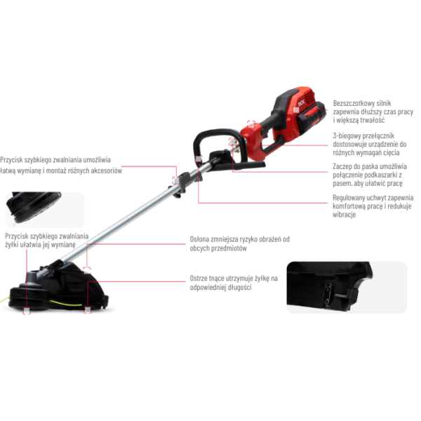 Podkaszarka wyposażona jest w szerokość cięcia wynoszącą 380 mm oraz system Bump-Feed, który umożliwia szybką i łatwą wymianę szpuli z żyłką. Ergonomiczny design i regulowany uchwyt zapewniają komfort podczas pracy, a kompaktowa i trwała konstrukcja gwarantuje długą żywotność urządzenia.