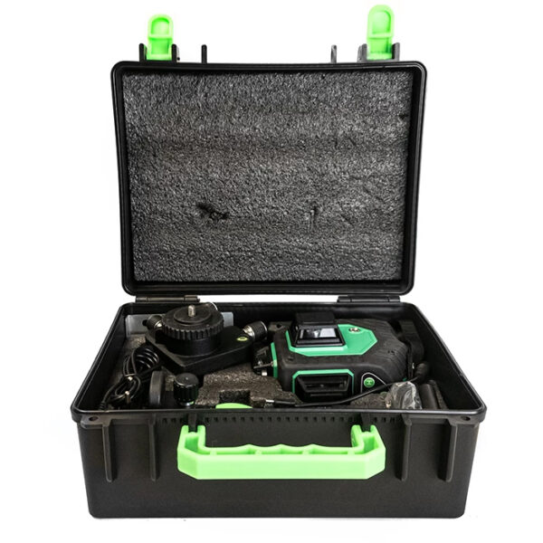 Laser krzyżowy D’Orly 3D 360G ma najbardziej kompletny wzór linii na rynku, co czyni go idealnym dla profesjonalnego instalatora. Zielone linie laserowe są 4 do 6 razy bardziej widoczne niż czerwone linie laserowe. Unikalna dla tego lasera jest przede wszystkim precyzyjna regulacja. Pozwala to na bardzo dokładne ustawienie 3D 360G we właściwej pozycji. Dzięki samopoziomującemu systemowi wahadła z tłumieniem magnetycznym, laser krzyżowy D’Orly 3D 360G szybko i dokładnie niweluje. Dzięki temu laser liniowy jest łatwy i szybki w użyciu. Poza zakresem poziomowania 3,5 ° laser liniowy zaczyna migać jako ostrzeżenie. Zapobiega to nieoczekiwanym błędom pomiaru. Laser krzyżowy D’Orly 3D 360G jest wyposażony w blokadę transportową. Ta blokada ma zapobiegać uszkodzeniu mechanizmu wahadłowego w przyrządzie podczas transportu. Blokada transportowa to także przycisk włączania/wyłączania. Tak więc, gdy laser liniowy zostanie wyłączony, zostanie automatycznie zablokowany.