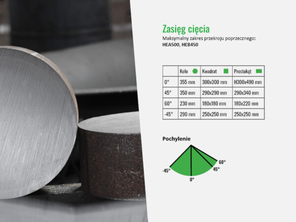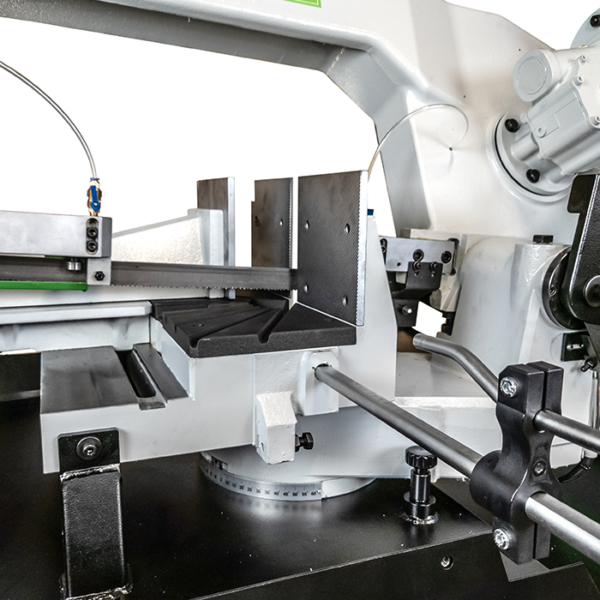 • Eggenberg EBS3770-A to hydrauliczna półautomatyczna piła taśmowa do cięcia żelaza i stali w zakresie od 0° do 60° w prawo